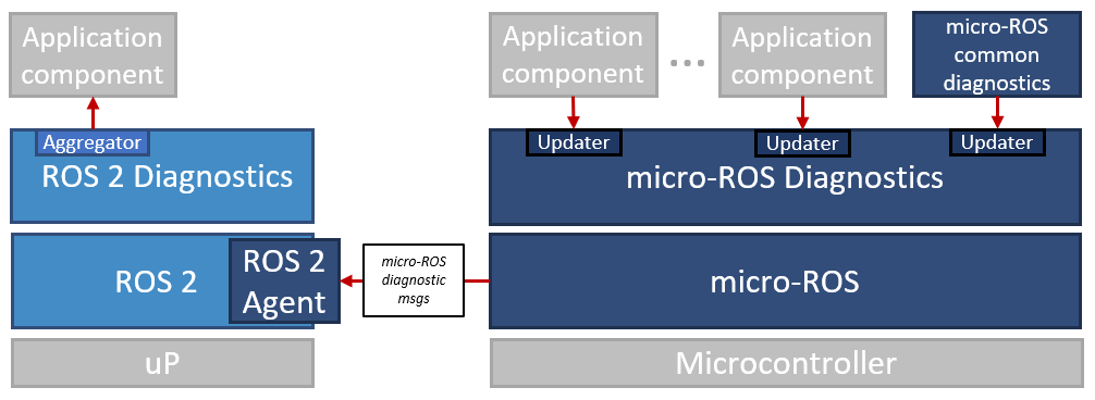 The micro-ROS diagnostics packages do not provide any aggregator as we assume that such aggregation takes place on a microprocessor running standard ROS 2. Hence, we assume the following typical architecture: