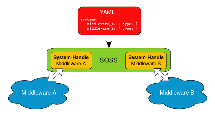 SOSS can act as an intermediate message-passing tool that, by speaking a common language, centralizes and mediates the integration of several applications running under different communication middlewares. A SOSS instance is configured and launched by means of a YAML file, which allows the user to provide a mapping between the different topics and services that two or more applications can exchange information about.
