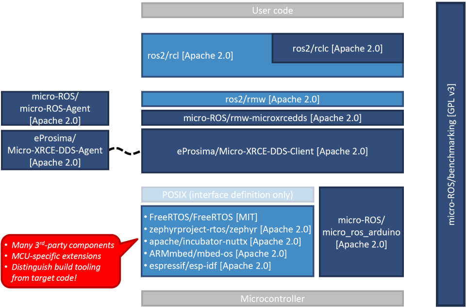 Things get particularly interesting at the RTOS level: The micro-ROS build tool micro_ros_setup and the various modules for external build systems are provided under Apache 2.0 but use or are combined with very differently licensed RTOS and board support components. The fact, that typical embedded toolchains build the whole software (RTOS, micro-ROS and application) into one binary image makes the situation more complex compared to typical desktop operating systems with clear separation of individual executables and the OS kernel (cf. for example the Linux syscall exception to GPL).