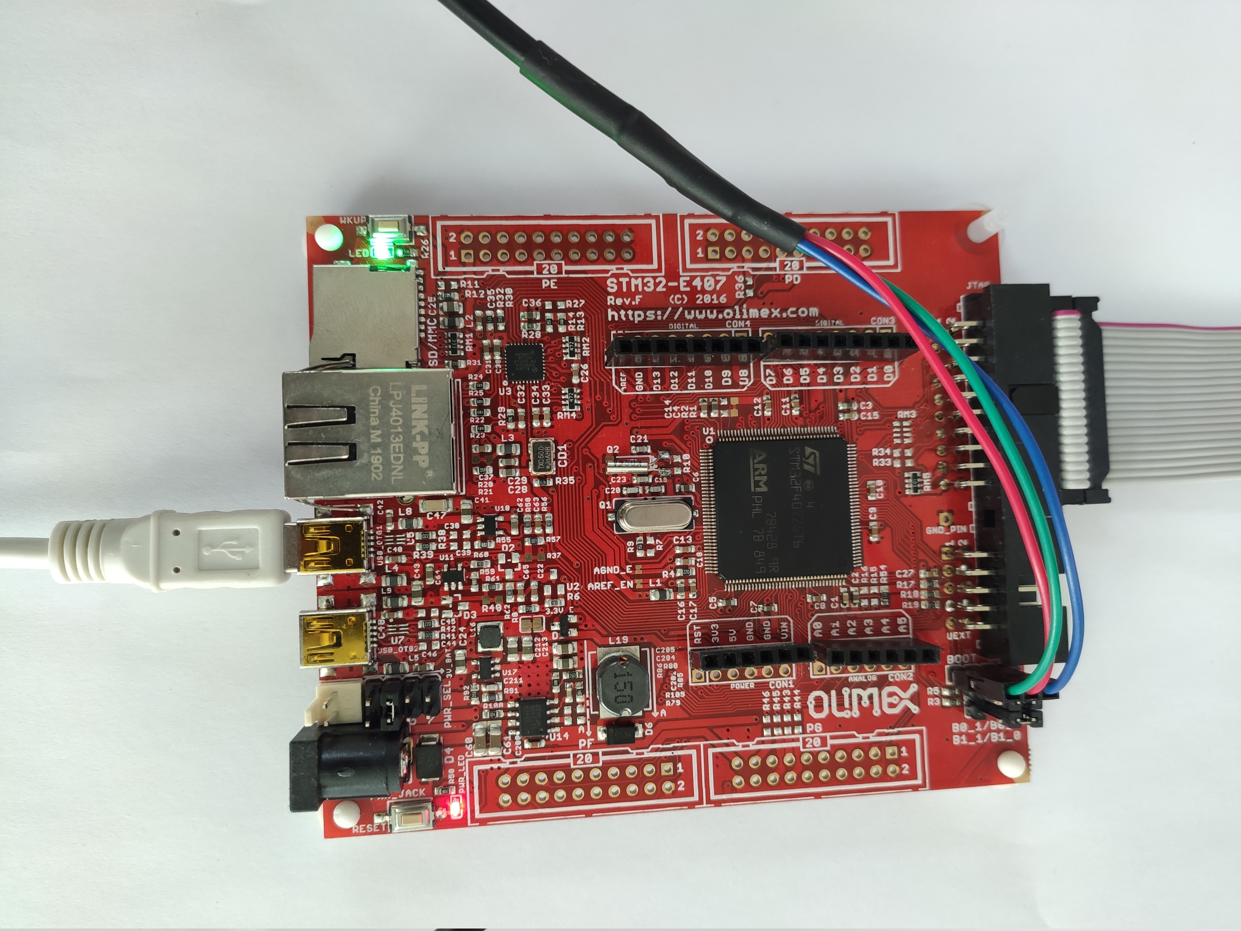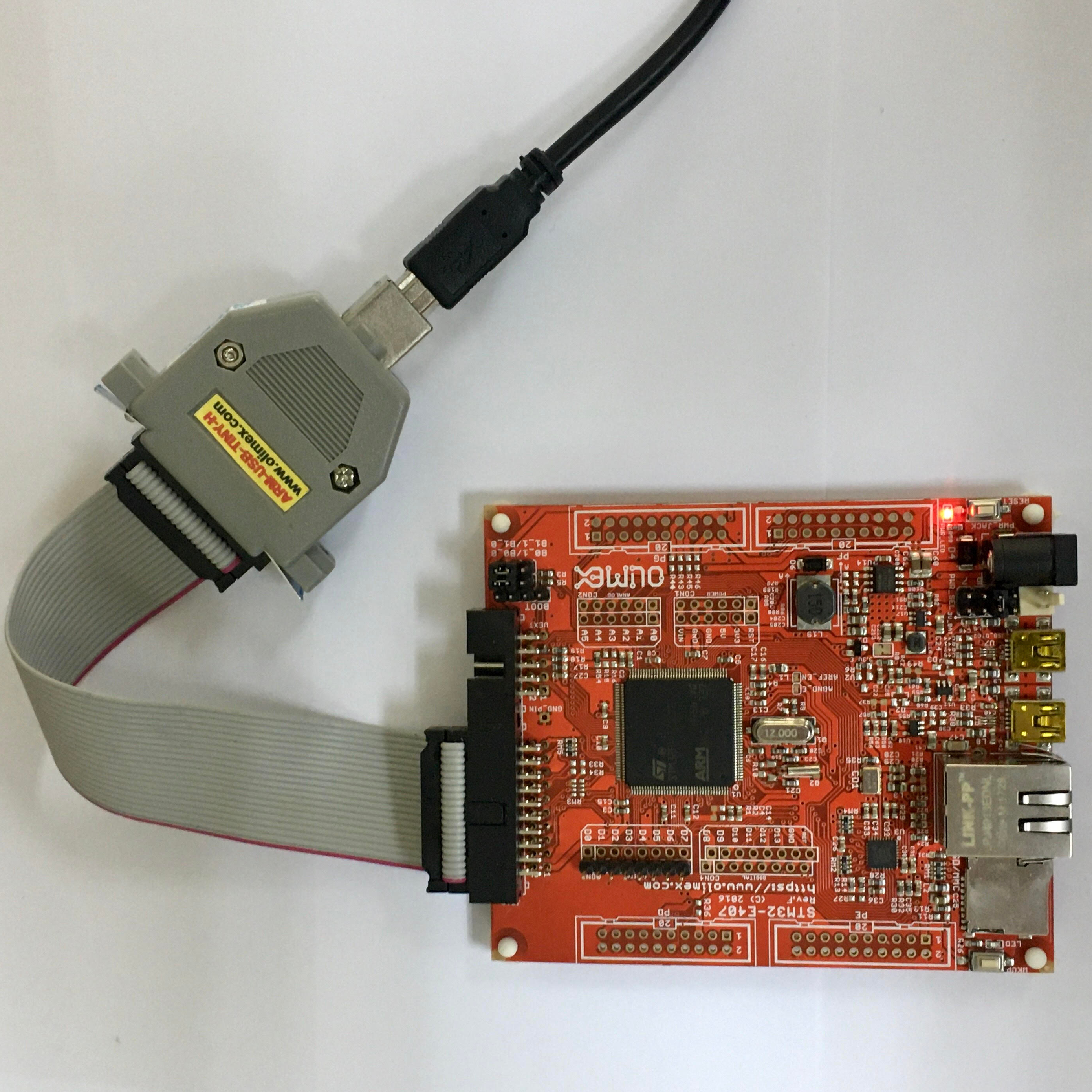 Flashing the firmware into the platform varies across hardware platforms. Regarding this tutorial’s target platform (Olimex STM32-E407), the JTAG interface is going to be used to flash the firmware.