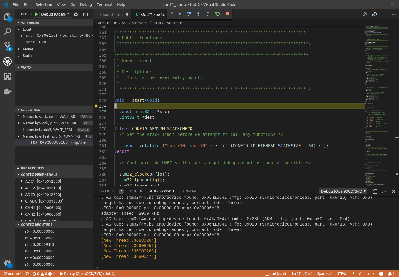 This connected to the gdb server running on port 3333 (OpenOCD default) of the same machine. It will sit on the NuttX _start function, which isn’t very interesting, so we let it continue.