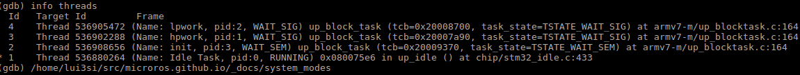 Now, if everything worked correctly, we should get some information from the RTOS, such as thread info. To test, type info threads at the gdb prompt to get a thread info table. Your output will very depending on the NuttX configuration. On my bare-bones NSH-only configuration, it looks as follows: