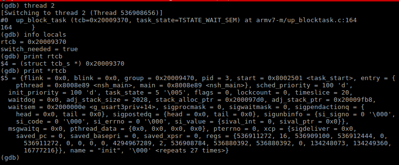 Most likely, NuttX has stopped in the idle thread, which isn’t very interesting. To inspect the others, we can use the thread command to switch a thread and then maybe display a backtrace and some variables. Try the following: