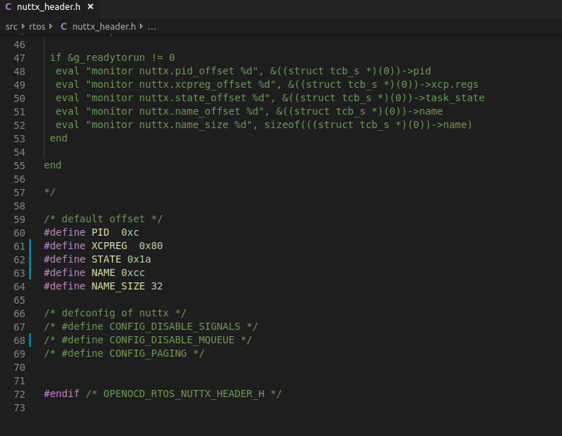 Now open openocd-nuttx/src/nuttx_header.h in your favor editor, locate the existing #define lines